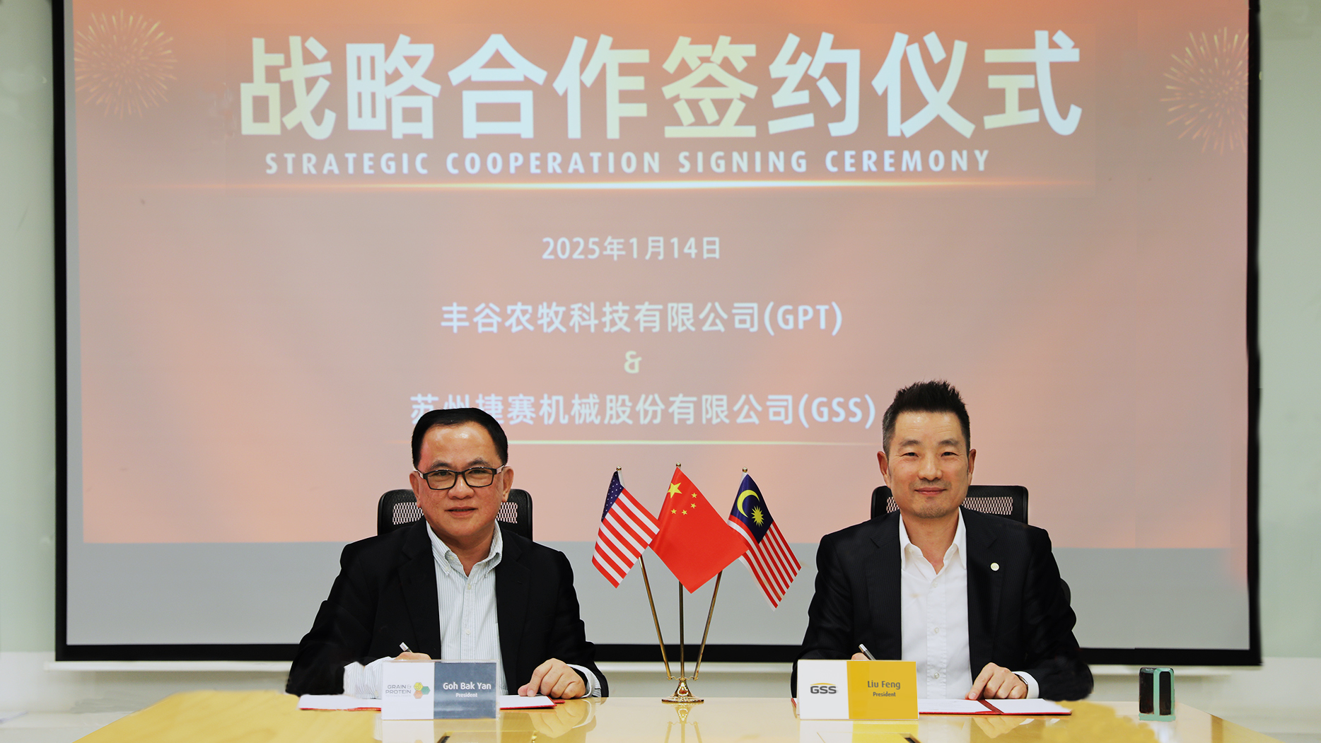 2025年1月14日,全球卓越的農(nóng)牧業(yè)解決方案領(lǐng)導者—GPT豐谷農(nóng)牧科技(Grain & Protein Technologies)與蘇州捷賽機械股份有限公司(GSS Systems)在蘇州捷賽總部正式簽署戰(zhàn)略合作協(xié)議。GPT豐谷農(nóng)牧科技亞太區(qū)總裁吳木鉛先生與蘇州捷賽總裁劉楓先生攜雙方團隊代表出席簽約儀式,共同見證這一里程碑時刻!